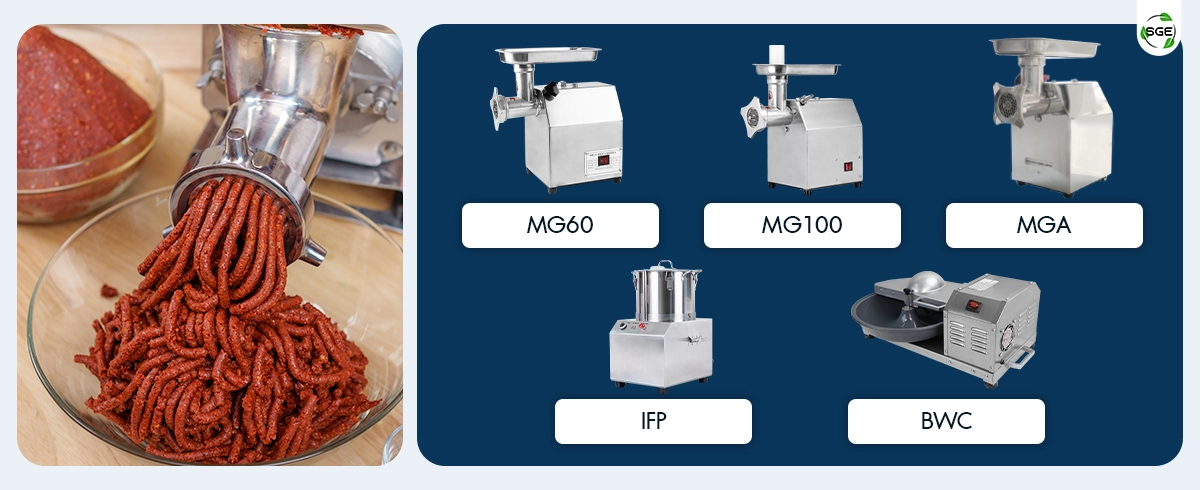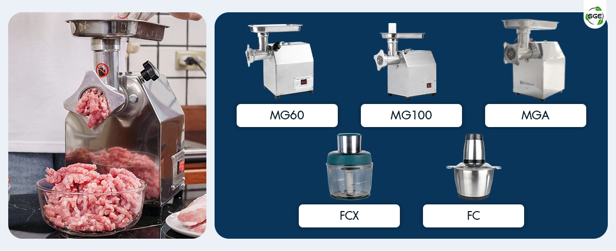 เนื้อทั่วไปหรือพริกแกง ใช้รุ่นมาตรฐานได้สบาย อย่าง MG60, MG100, MGA แต่ถ้าจะบดโครงไก่ให้เลือกเครื่องมอเตอร์แรง และถ้าเป็นงานทำลูกชิ้น/น้ำจิ้ม ต้องใช้เครื่องสับผสมโดยเฉพาะ เช่น รุ่น IFP หรือ แบบกระทะ