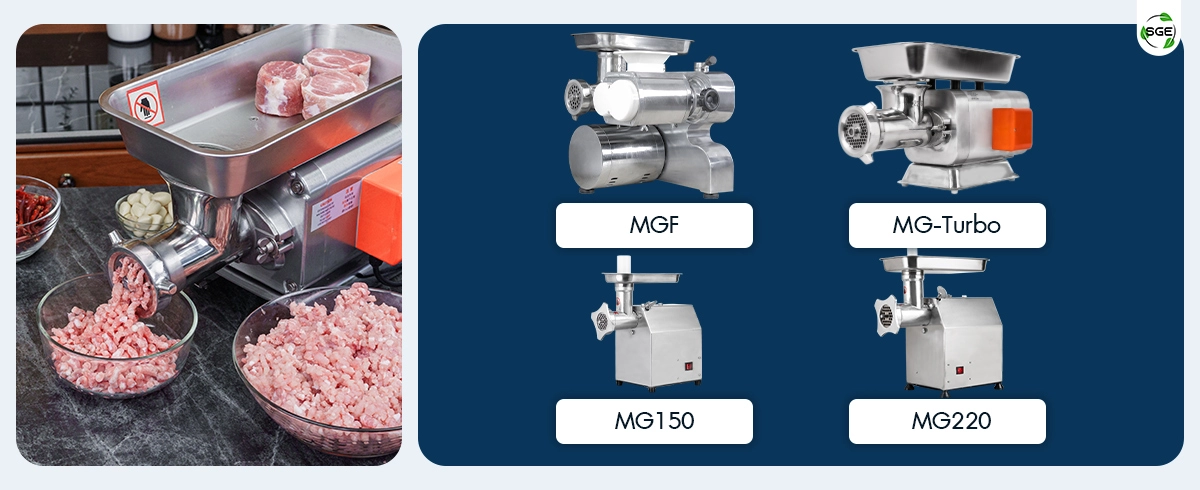 แต่ถ้าเป็นร้านอาหารหรือ SME ที่ต้องบดต่อเนื่อง 70–150 กก./ชม. ควรเลือกรุ่นที่รองรับงานหนัก ควรเลือก รุ่น MG60, MG100 หรือ MGA ที่ออกแบบมาสำหรับงานหนักโดยเฉพาะ