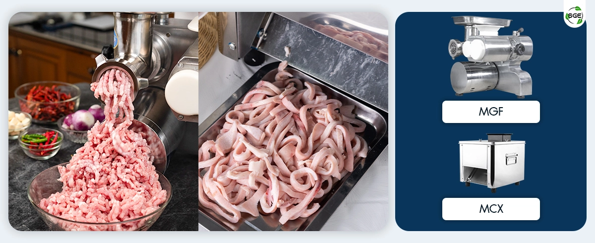 ธุรกิจที่ต้องบดและหั่นควรเลือกรุ่น 2-in-1 เช่น MGF หรือรุ่น 2 หัว ที่ทำได้ทั้งบดและหั่นในเครื่องเดียว แต่ถ้าต้องการหั่นหมูแช่แข็งบาง ๆ สำหรับชาบู ควรใช้เครื่องหั่นเฉพาะทางอย่าง MCX