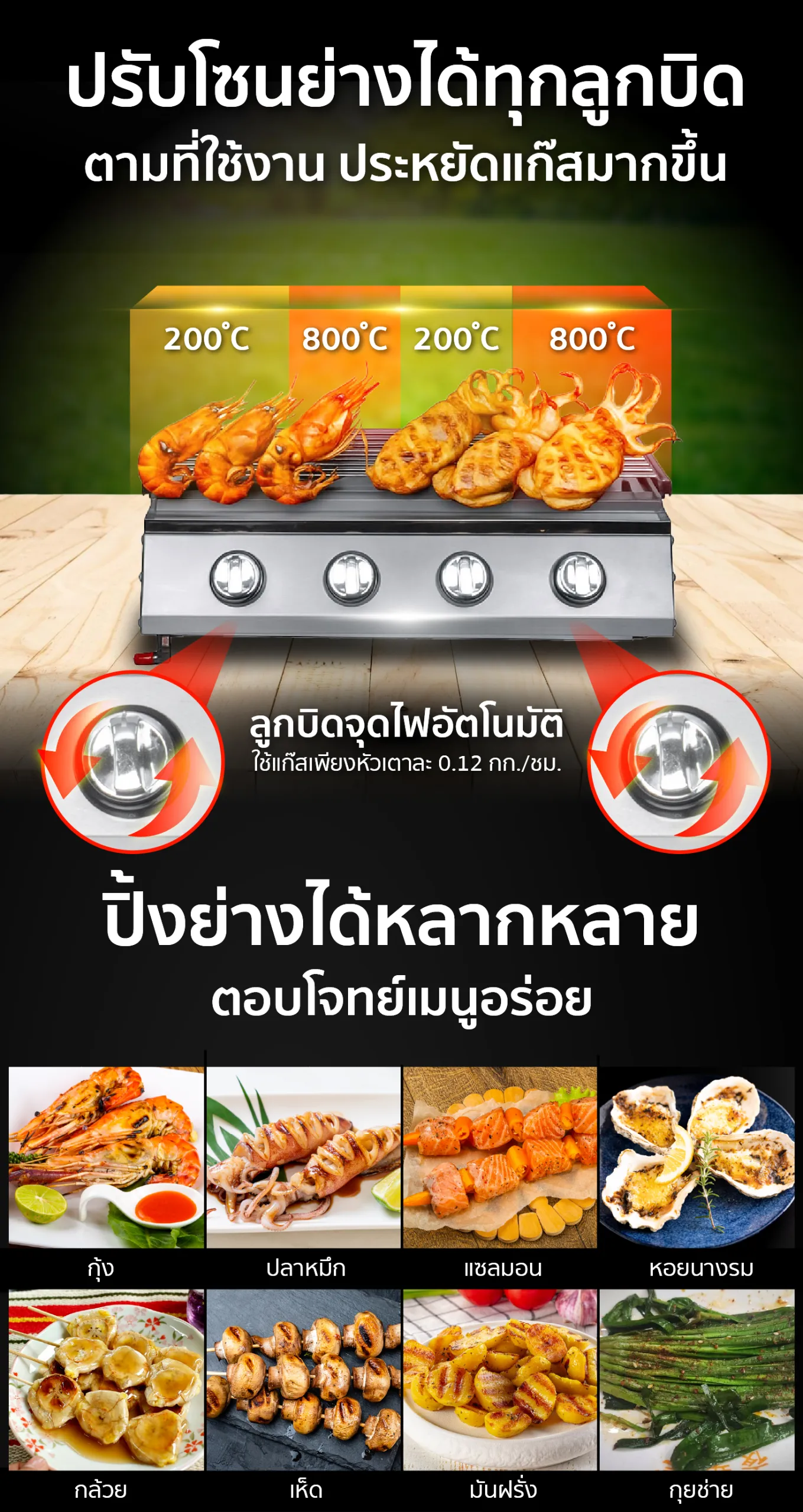 เตาปิ้งย่างอินฟราเรด ฝาครอบเหล็ก เหมาะใช้ปิ้งย่าง กล้วย, ลูกชิ้น, หมึก, กุ้ง, หอย ฯลฯ คุมอุณหภูมิแม่นยำ แยกสวิตช์ควบคุมแบบแผงต่อแผง เลือกเปิดได้เท่าที่ใช้งาน ใช้แก๊สแค่แผงละ 0.12กก./ชม. เหมาะมากสำหรับเริ่มต้นธุรกิจ, ร้านอาหาร, เปิดท้ายขายของ ฯลฯ