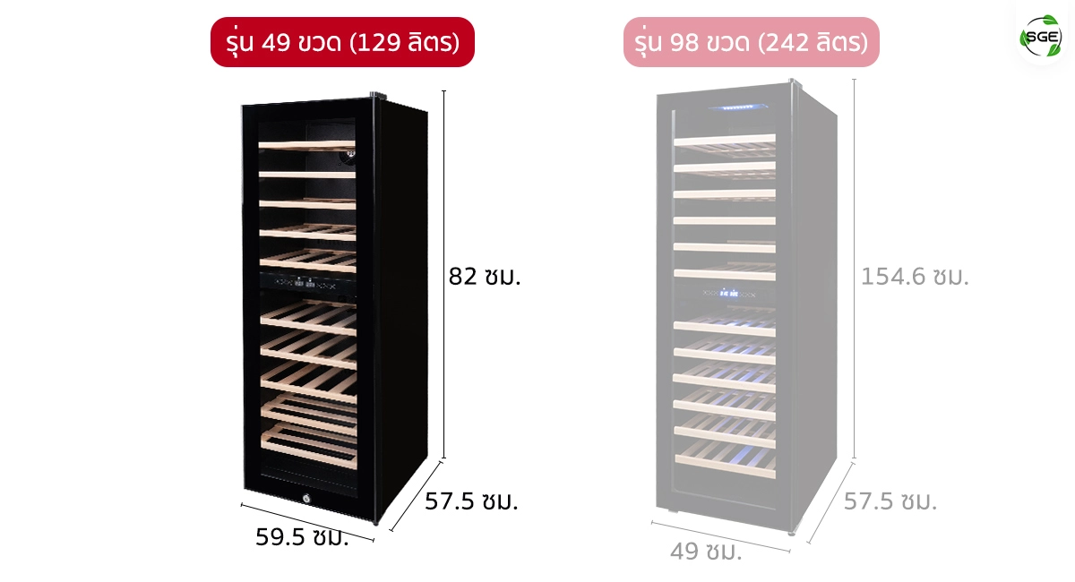 ตู้เก็บไวน์ / ตู้แช่ไวน์ ของ SGE ช่วยถนอมรสชาติของไวน์อย่างมีประสิทธิภาพ ความจุ 49 ขวด เป็นตัวช่วยการเก็บรักษาเเละถนอมรสชาติไวน์ให้อยู่ได้นานที่สุด สามารถตั้งค่าอุณหภูมิให้เหมาะกับไวน์เเต่ละชนิดได้ พร้อมระบบป้องกันไม่ให้ไวน์เเข็งตัวเป็นน้ำเเข็ง