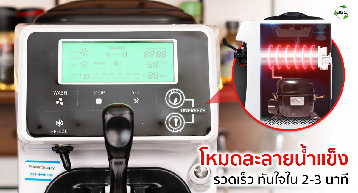 หมดปัญหากดไอศกรีมออกมาไม่ได้ เพราะกระบอกสูบเกิดการแช่แข็ง เพียงแค่กดปุ่ม Hard และปุ่ม Soft พร้อมกัน เครื่องจะเข้าสู่โหมดละลายน้ำแข็งอย่างรวดเร็ว ใช้เวลา 2-3 นาที เครื่องจึงจะพร้อมเข้าสู่กระบวนการขึ้นรูปไอศกรีมใหม่อีกครั้ง