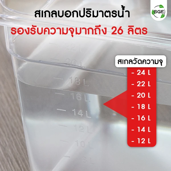 อ่างรองรับความจุมากสุดถึง 26 ลิตร มาพร้อมสเกลบอกปริมาตรน้ำ