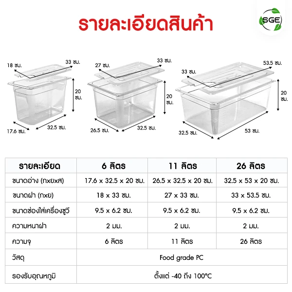 | รายละเอียด | 6 ลิตร | 11 ลิตร | 26 ลิตร |