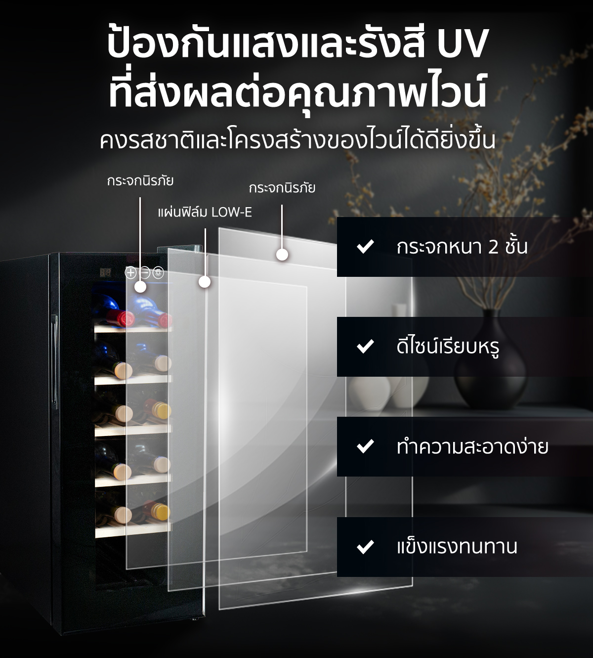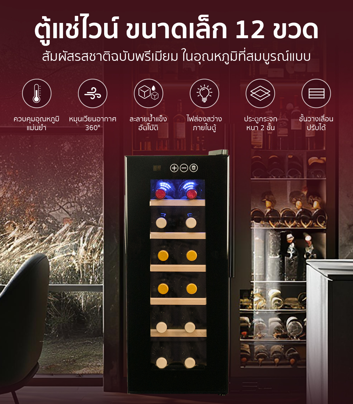 ตู้เเช่ไวน์ ขนาดเล็ก 12 ขวด ถนอมรสชาติอันเป็นเอกลักษณ์ของไวน์ ให้พร้อมทานได้ตลอดเวลา ด้วยเทคโนโลยีควบคุมอุณหภูมิและความชื้นอัจฉริยะ ที่ออกแบบให้เหมาะกับการเก็บไวน์ เพื่อคนรักไวน์โดยเฉพาะ