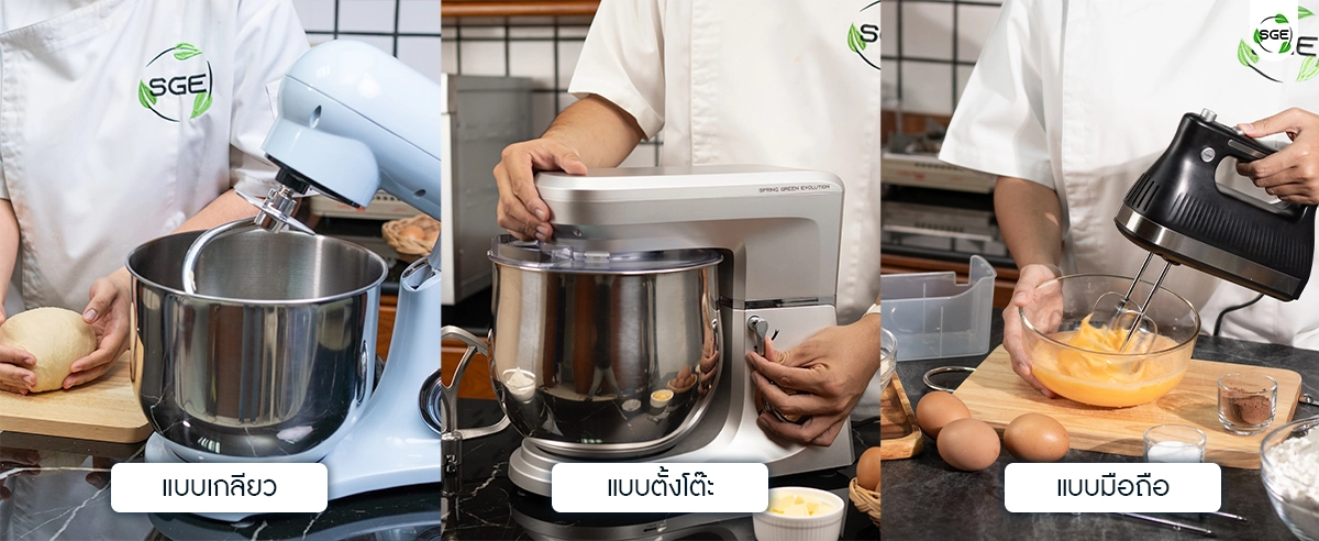 - แบบชุดเครื่องผสมพร้อมโถ ผลิตขึ้นมาเพื่อใช้ในอุตสาหกรรมผลิตเบเกอรี่โดยเฉพาะ มีฟังก์ชันปรับระดับแรงตีผสมได้ถึง 3 ระดับ สามารถเปลี่ยนหัวตีได้ 3 ชนิด คือ หัวตีรูปตะกร้อ หัวตีรูปตะขอ และหัวตีรูปใบพาย-ใบพัด มาพร้อมกับโถผสม ราคาสูงกว่าสองแบบแรก แต่จะสะดวกและรวดเร็วต่อผู้ประกอบการมากกว่า