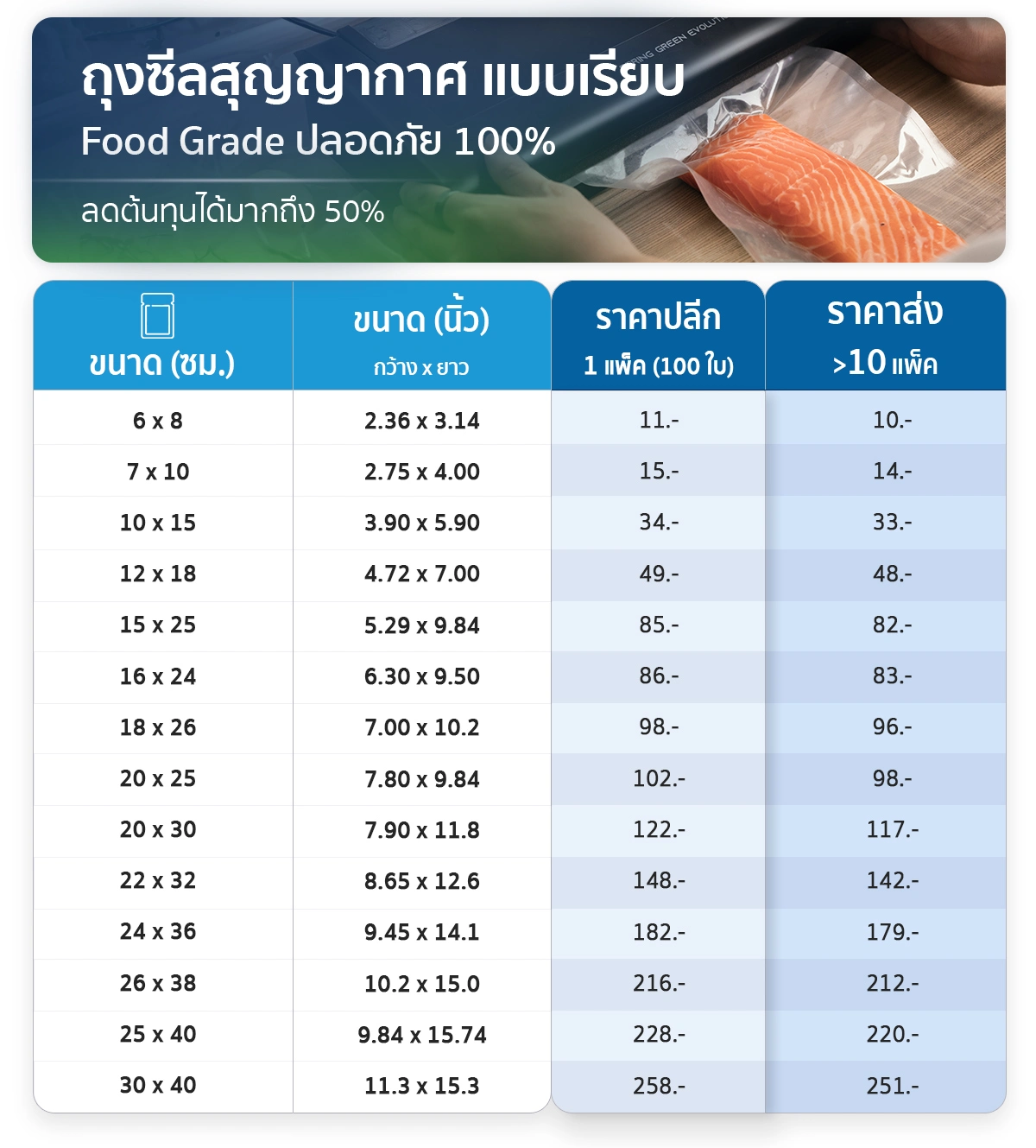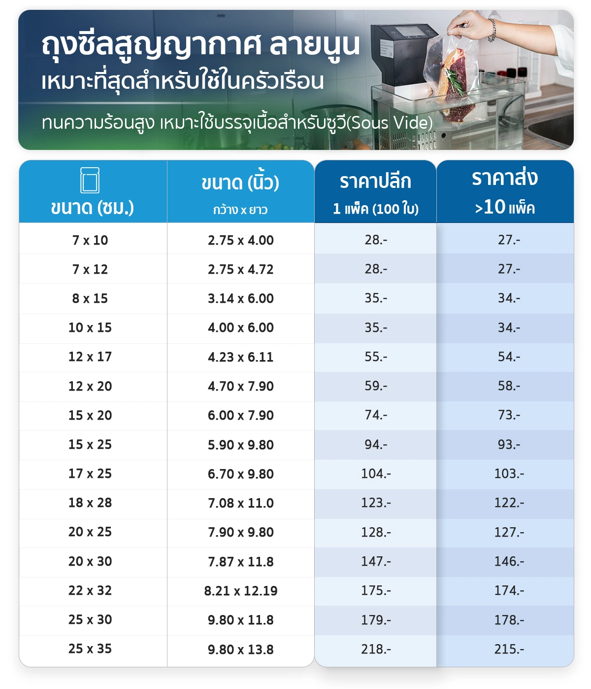 รองรับทั้ง เครื่องซีลแบบลิ้นดูด และ เครื่องซีลแบบห้องสุญญากาศ