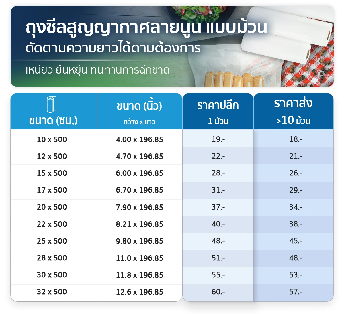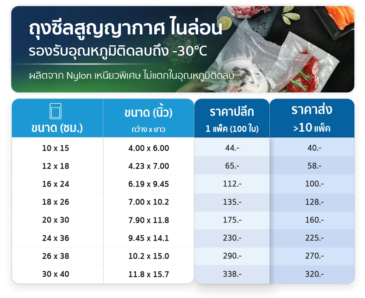 วัสดุหนา เหนียว ทนร้อน เหมาะกับสินค้าที่ต้องการเก็บระยะยาว หรือใช้แช่แข็งได้ใช้งานได้ทั้ง เครื่องซีลแบบลิ้นดูด และ เครื่องซีลแบบห้องสุญญากาศ
