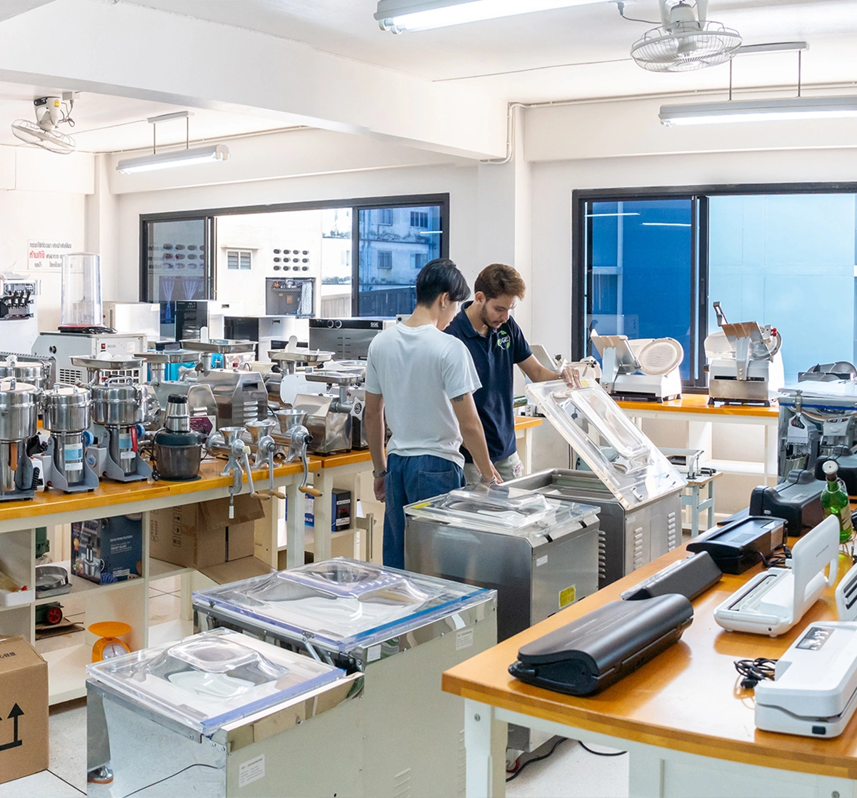 ลูกค้าสามารถนัดหมายเพื่อเข้าชมหรือทดลองสินค้า เครื่องซีลสูญญากาศ หม้อทอดน้ำน้ำมัน เครื่องล้างผัก และสินค้าอื่นๆ